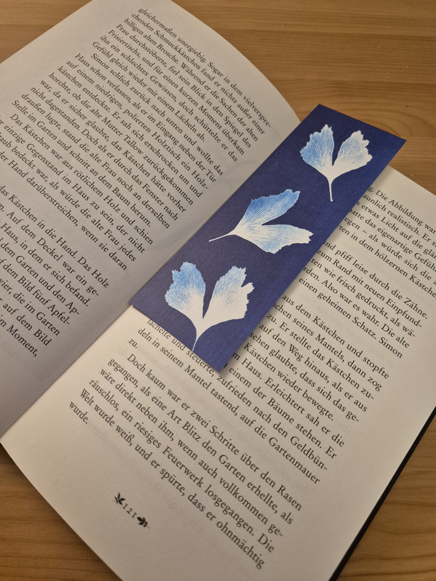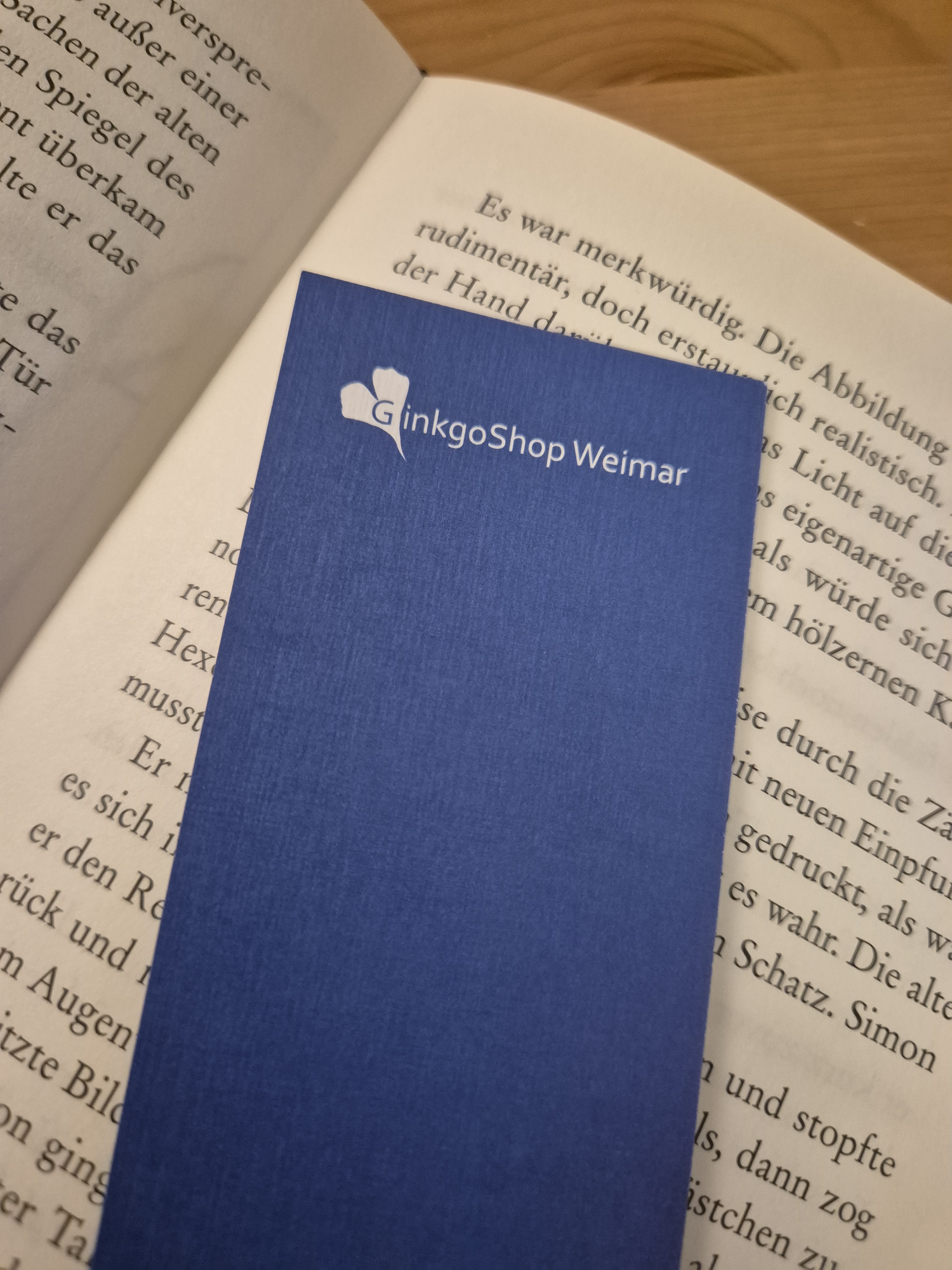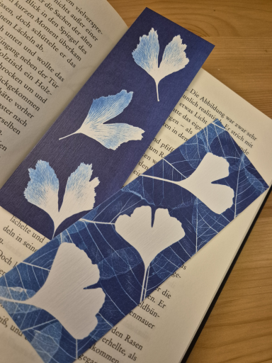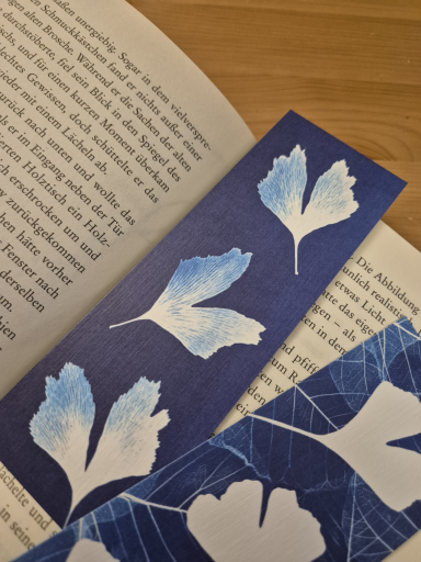 Für den Ginkgoshop in Weimar sind besondere Lesezeichen mit Ginkgomotiv entstanden – maßgeschneiderte Unikate in Blau von der Motiverstellung bis zum Druck: