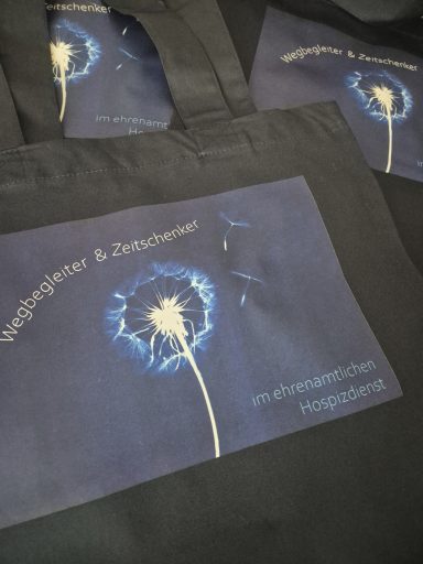 Zum Weihnachtsfest erhalten die ehrenamtlichen Mitarbeiterinnen des ambulanten Hospizdienstes Weimar und Erfurt ein besonderes Dankeschön: individuell gestaltete Baumwolltaschen mit einem filigranen Blaudruck. Die hochwertigen Stoffbeutel sind nach persönlicher Absprache mit einer Cyanotypie im Transferdruck versehen. Das Motiv "Haferwurzel" wurden nach eigenen Wünschen ausgewählt und steht für die Vergänglichkeit des Lebens, wobei die tiefblaue Bildtechnik die Begleitung in stillen Momenten symbolisiert. Die Tasche drückt die Anerkennung für das Engagement und die Menschlichkeit der Ehrenamtlichen aus.